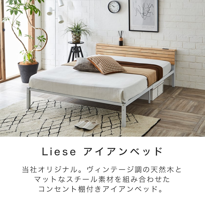 リーセ ヴィンテージ調アイアンベッド ベッドフレームのみ ダブル 棚付きベッド コンセント 黒 ブラック ベッド おしゃれ ベッドフレームのみ ダブルサイズ ダブルベッド 宮付きベッド 脚付きベッド 新商品