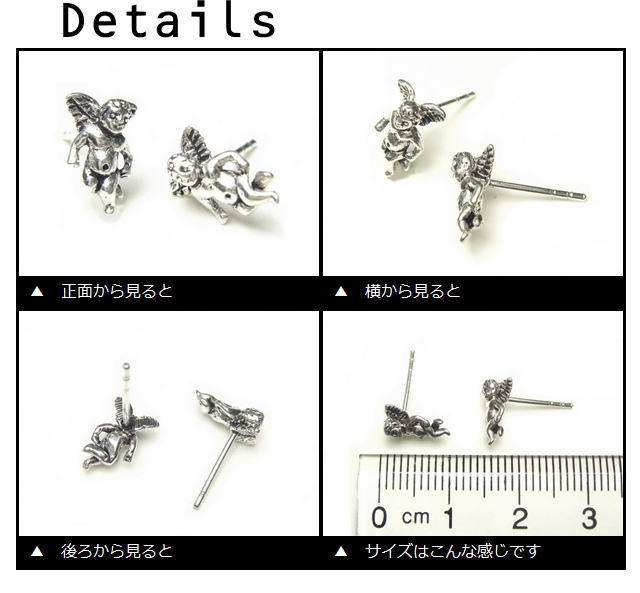 他のメンズアクセもチェック!素材シルバー925サイズ◆モチーフサイズ:(タテ×ヨコ×アツミ)約10×6.5×4.5mm◆ポスト長さ:約10mm◆ポスト厚み:約0.8mm 個数ペアー売り(1組2個セット)耳にフィットするシリコンキャッチ付き特徴小さいながら、羽の一枚一枚や表情までこだわった天使のピアス。
